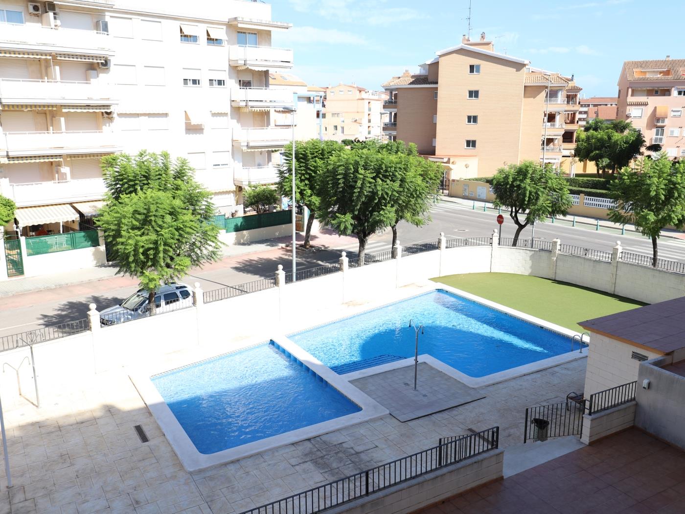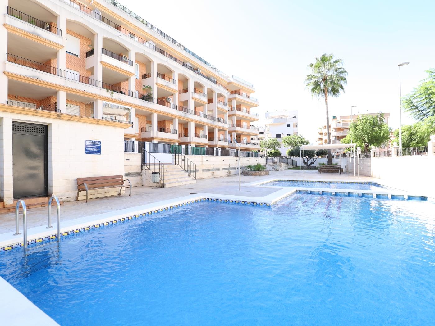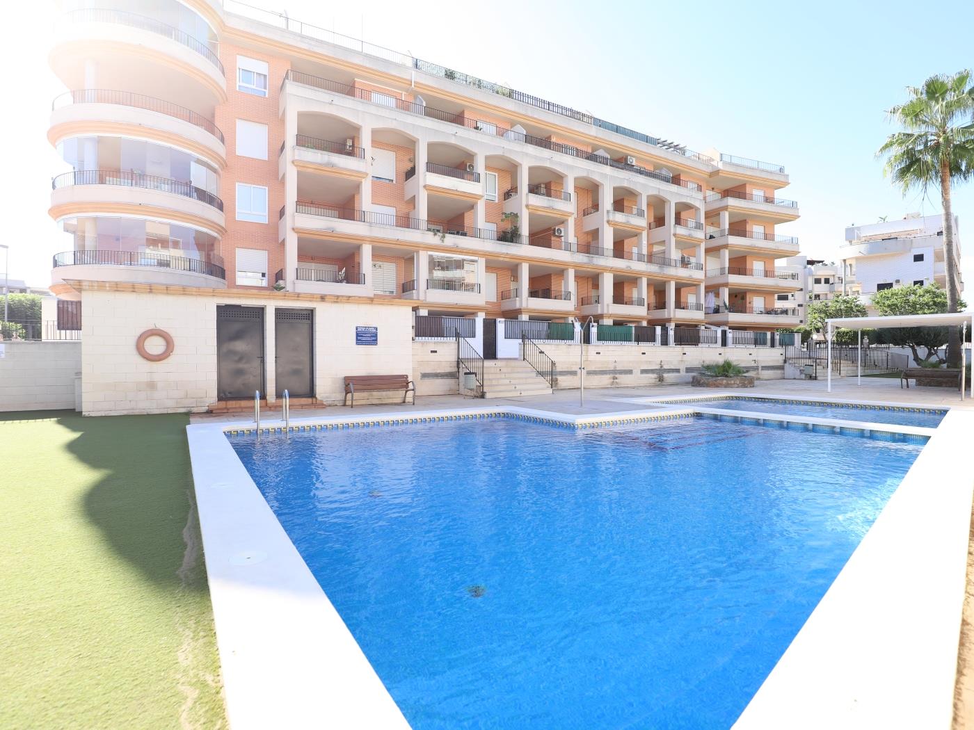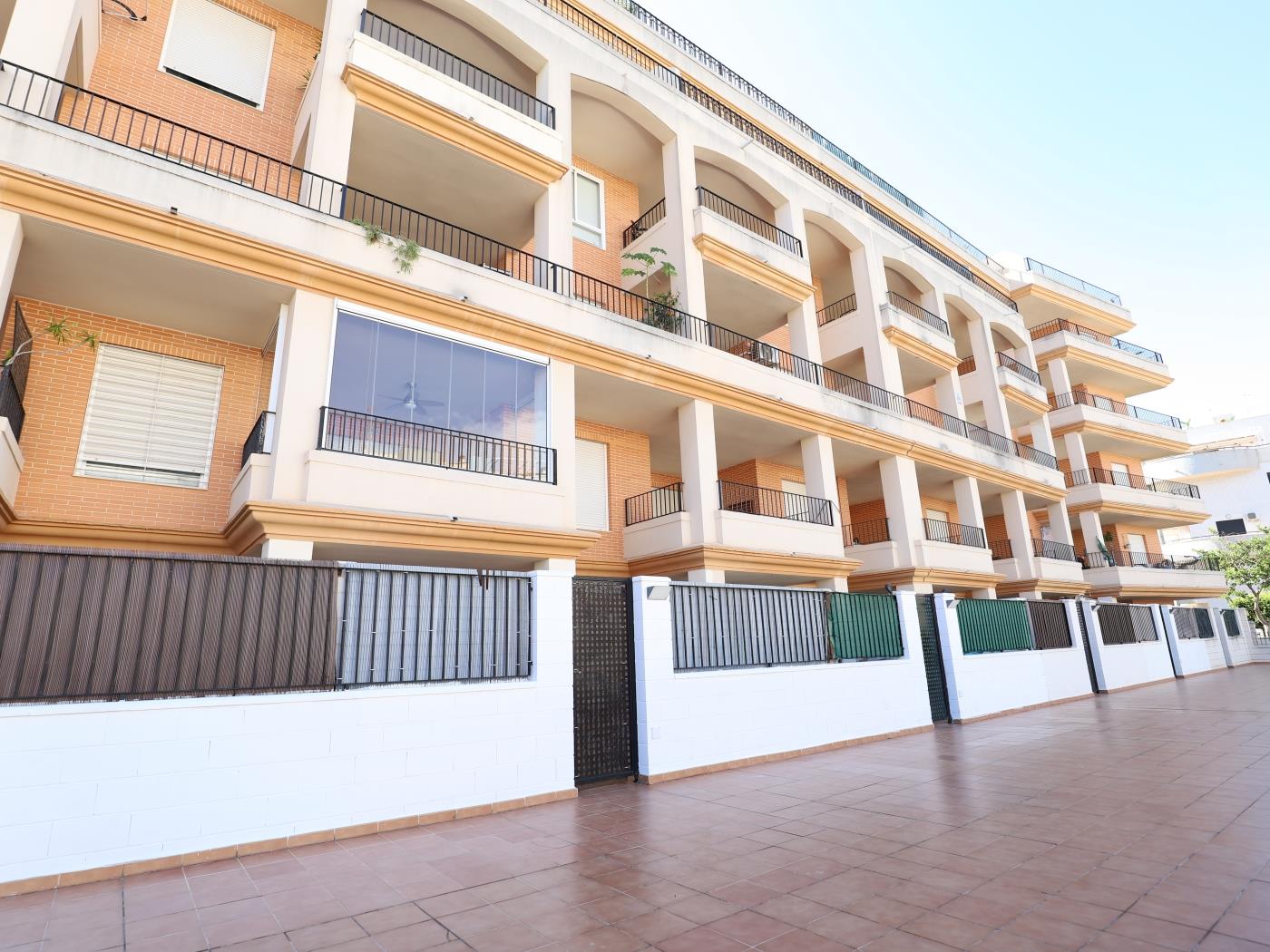 En una de las poblaciones de playa más elegantes y prestigiosas del Levante. Perfectamente ubicado en una de las mejores avenidas de la población. Junto a un gran supermercado, panadería, los mejores restaurantes y dentro de una urbanización de lujo, perfectamente cuidada, con dos preciosas piscinas, duchas para su regreso de la playa, y zonas verdes en un entrono vigilado y vallado en el que la familia podrá estar tranquila.