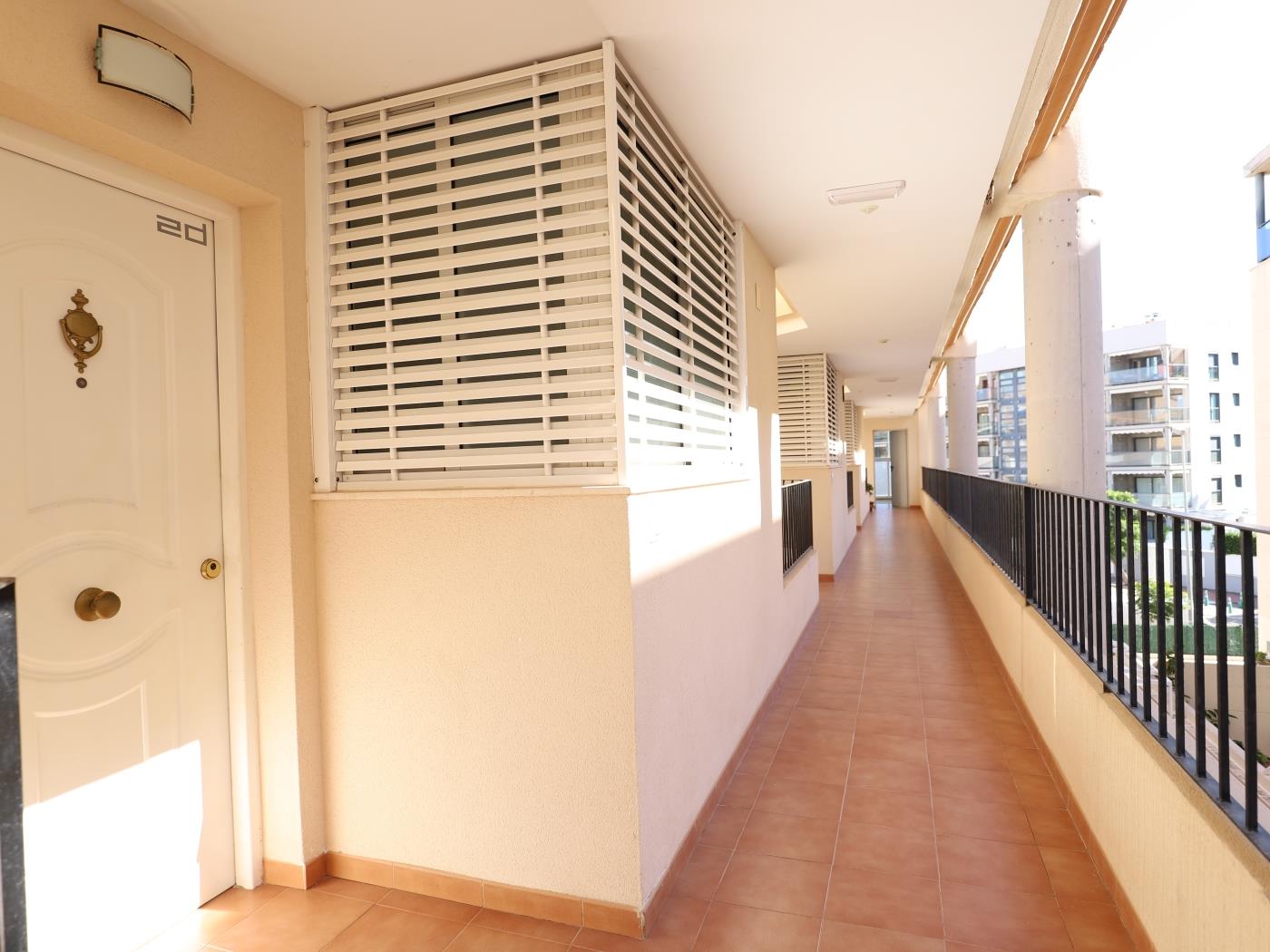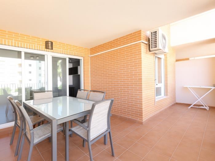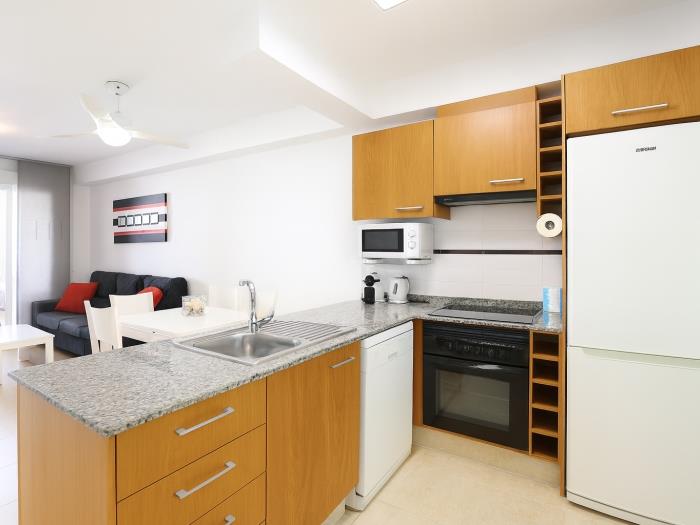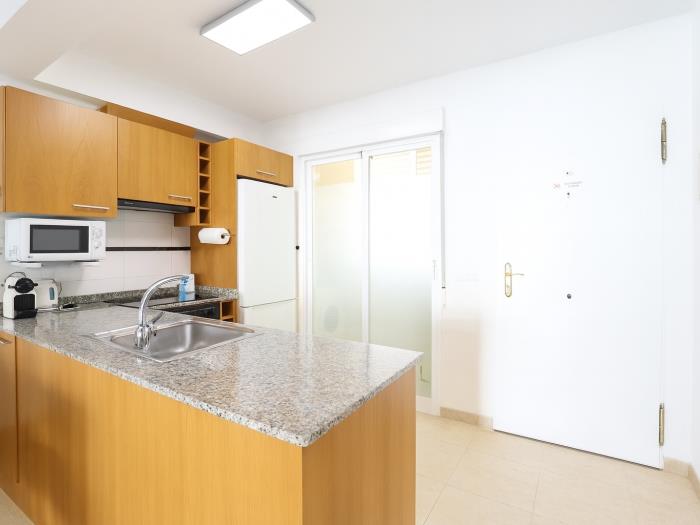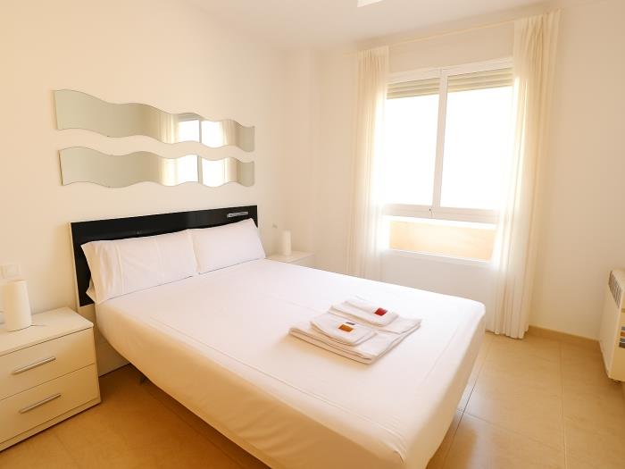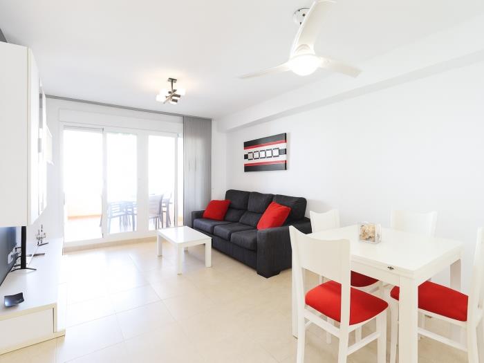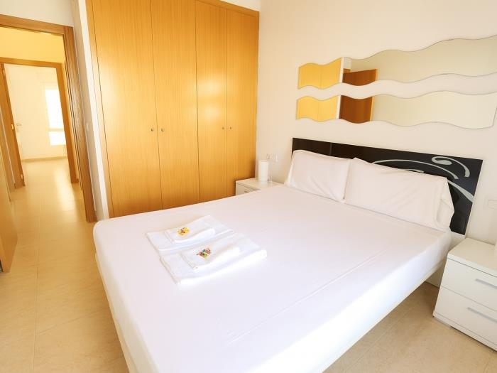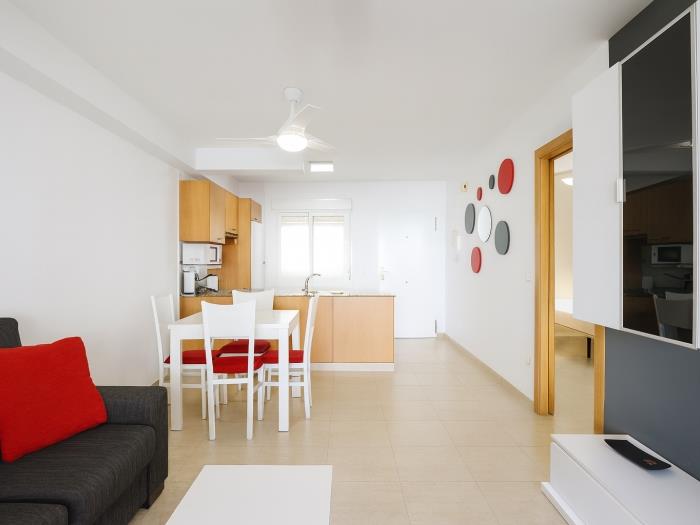 Se trata de un apartamento que dispone de dos habitaciones con una cama doble cada una, el salón y cocina ofice, una gran terraza con vistas a la piscina donde pueden cenar cómodamente 6 personas y el baño completo con bañera. El salón dispone de aire condicionado y las habitaciones de ventiladores de techo.